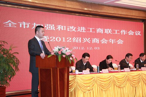 绍兴市加强和改进工商联工作会议暨2012绍兴商会年会于12月3日上午在绍兴市国际大酒店召开,省工商联副主席赵小敏,绍兴市委书记张金如,市委副主席王文序,市委常委、秘书长魏伟,市委常委、常务副市长陈月亮、市政协副主席倪善贵、何小玲等出席会议。我联合会王黎明联席会长,上海亿兆投资集团董事长裘德荣副会长代表联合会参加会议,绍兴市委副书记王文序主持会议。